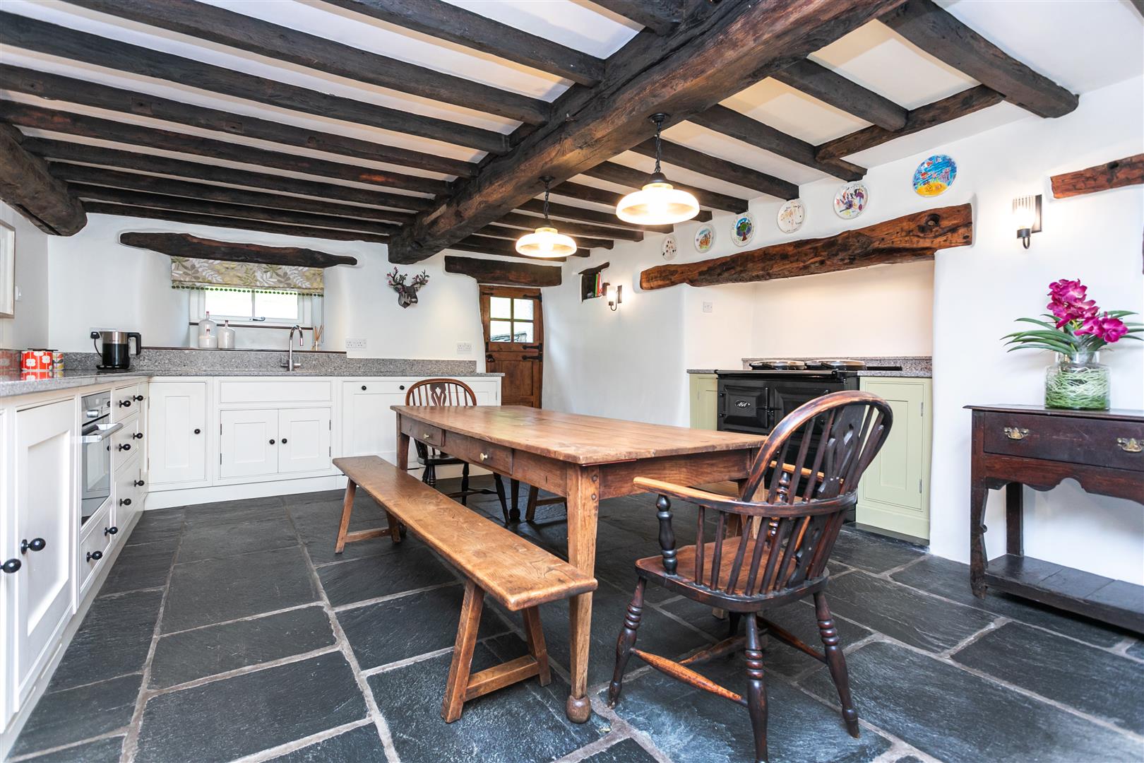 A substantial wide oak boarded front door with feature black ironmongery opens to a beamed and flagged hall, the flagged floor continues into the sitting room with a Jotul multi fuel stove and there are three shelved recesses. As the beating heart of any country retreat, the kitchen here lives up to expectations. Beautifully appointed with hand painted cream custom made cabinets and granite work tops there is an Aga, surely a country living essential, this time, in stylish charcoal to echo the flagged floor. Integral Siemens appliances comprise a combination oven and microwave, fridge, freezer, dishwasher and washing machine. For extra storage there’s a lovely deep pantry cupboard with doors painted in a soft sage green. There’s also a small salt cupboard set to the right of the Aga and on the opposite side, a handy niche for display. At the back of the kitchen an oak stable door with feature black ironmongery opens to the garden.